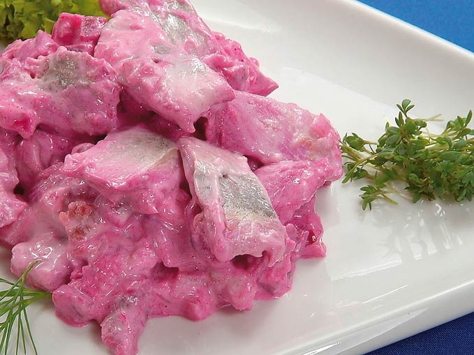 Premium-Heringshappen, saftige Äpfel und Rote Bete in köstlicher Sahne-Mayonnaise, Fischeinwaage: 45 %